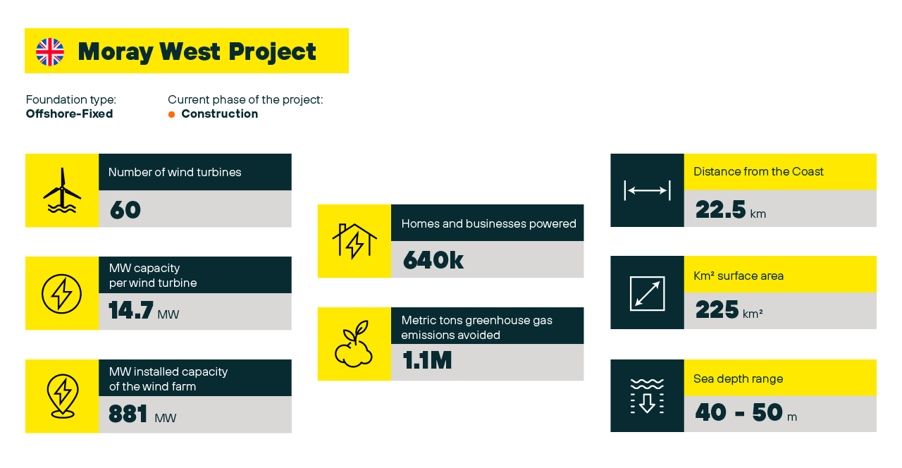 Moray West is an offshore wind farm located next to Moray East in the outer Moray Firth, off the northeast of Scotland, and is principally owned by Ocean Winds with a small minority stake held by UAB Ignitis Renewables. Moray West has successfully finished its construction phase, achieved safe and quality delivery of the project on schedule and reached full power in April 2025.