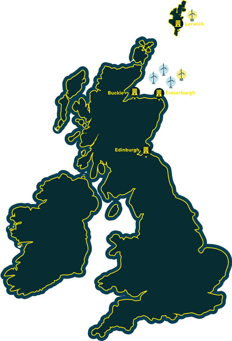 Supported from our Edinburgh office, a global centre of excellence for the industry since its establishment in 2010 and operated from purpose-built operations bases in Fraserburgh and Buckie, we are committed to the transition to clean power, supplying the UK with green renewable energy.